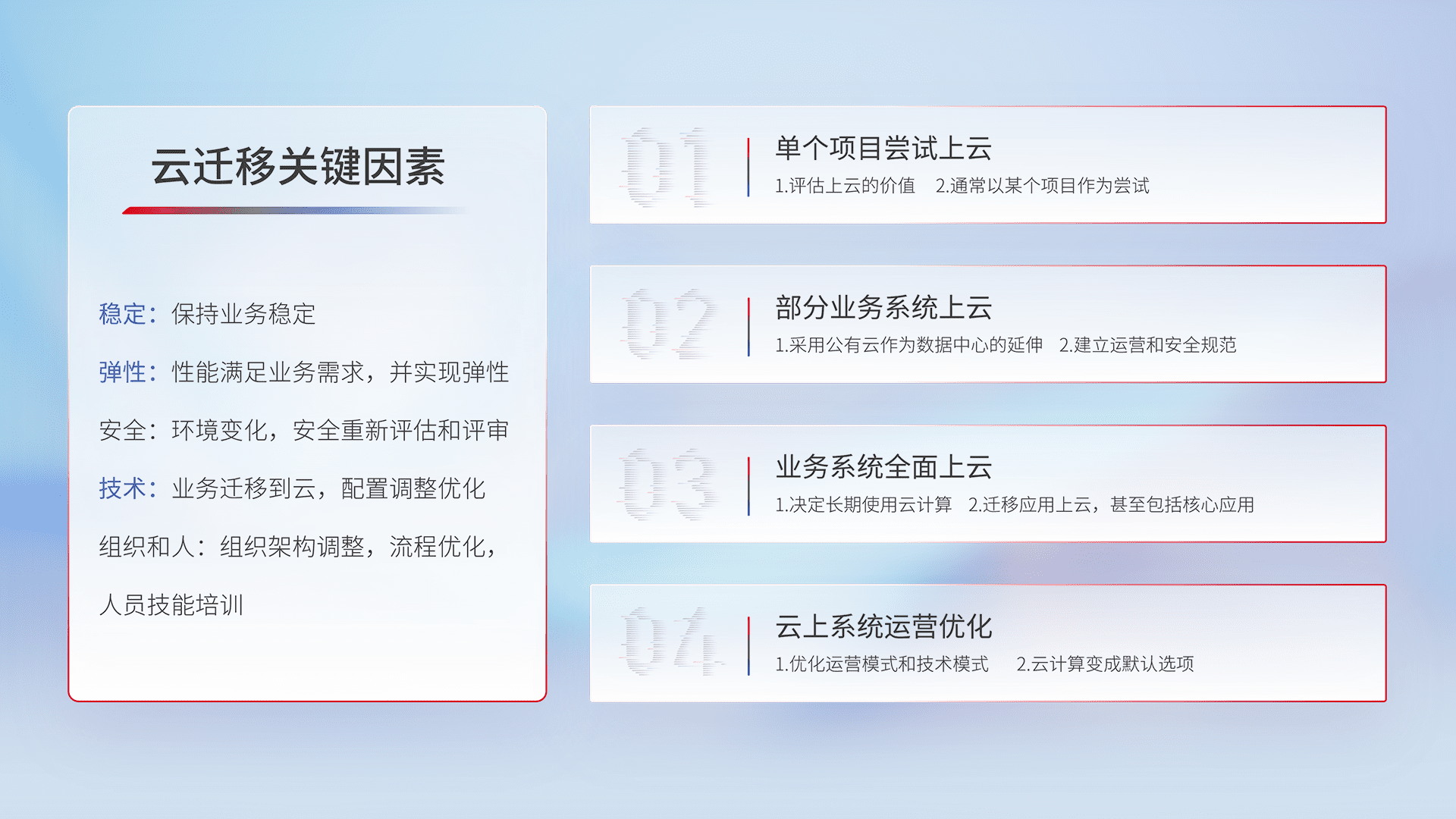结合实际业务,,,,从规划设计、、、云平台选型、、、、云原生改造、、、数据迁移、、、、集成交付,,迁移全过程为客户识别最佳上云路径,,,做好风险识别管理,,,,设计网络架构、、身份权限、、、、安全审计合规、、、、操作审计、、、日志审计、、、监控告警策略、、、、多站点容灾设计等,,对云上基础设施进行整体规划,,,提升IT治理水平,,,以满足弹性、、、、高可用、、、高性能的需求。。。。