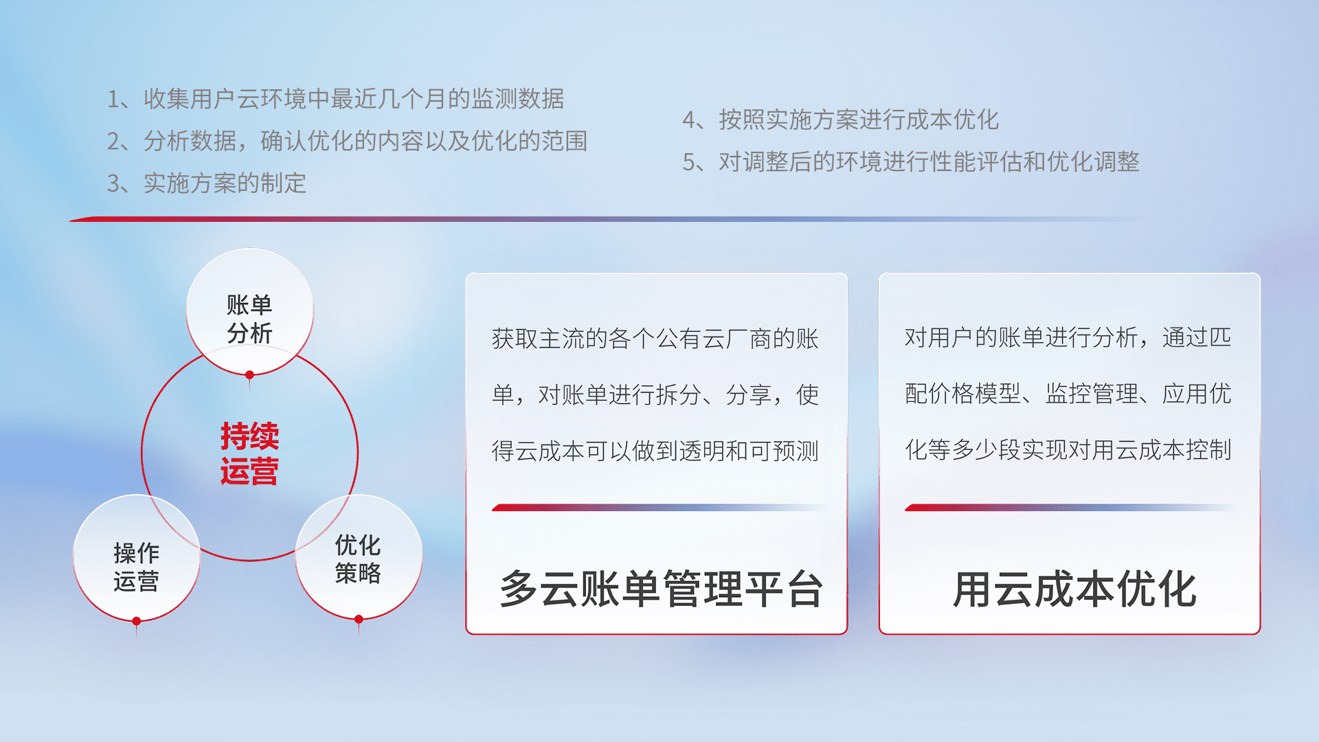 通过多云纳管,,以统一的资源数据模型把客户的云资源进行抽象和封装,,,进而实现对多云资源的统一操作,,,保障云资源管理的可靠性、、稳定性与可用性。。量身定制化运维内容,,,配置、、、、开发运维、、补丁管理、、、、备份、、监控、、、认证和访问管理、、、审计和日常巡检等,,,保障在用云过程中的可靠度,,,稳定度以及高可用率。。