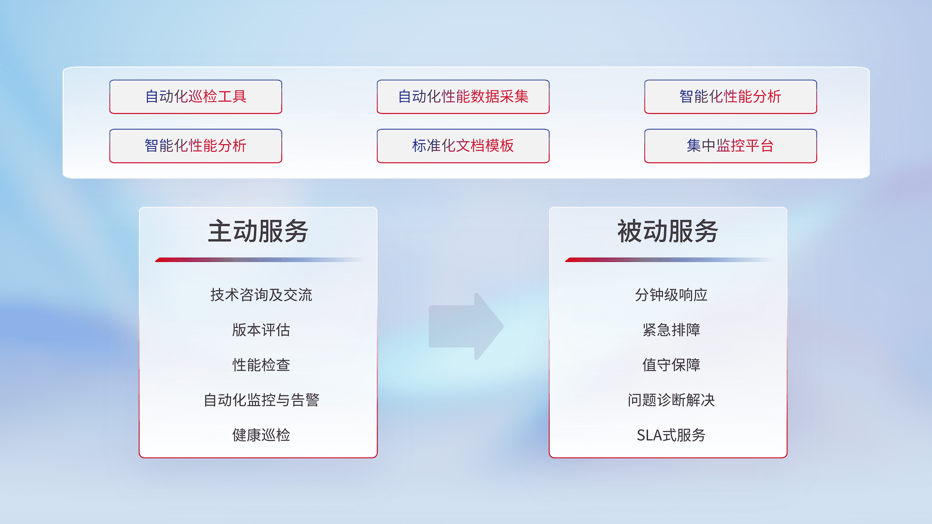 智能化工具和标准化文档,,保障服务质量,,,,提供主动服务(包含技术咨询、、、、版本评估、、、性能检查、、、自动化监控与告警、、、健康巡检)和被动服务包含(分钟级响应、、紧急排障、、值守保障、、、问题诊断解决、、、、SLA服务)。。。。